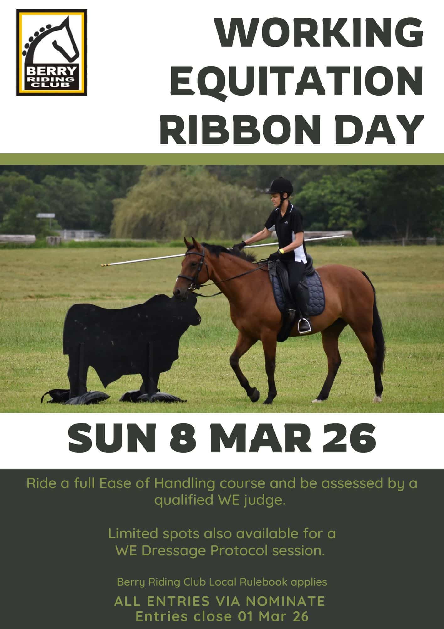 Ride for a Ribbon: A fantastic opportunity to ride a full WE Obstacle Course and be assessed by a qualified WE judge, Mrs Beverly Varoutsos.